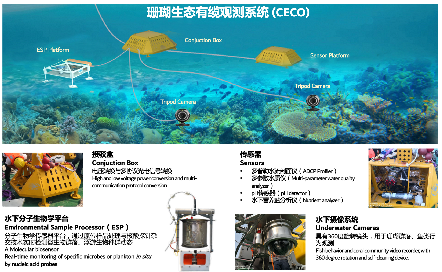 CECO integrates hydrological, water quality, ecological parameter monitoring, and underwater imaging technology, and realizes real-time monitoring and display through the online transmission of seafloor optical cable. It can obtain hydrodynamic, water quality, ecological parameters, as well as parameters of reef biological community, such as coral coverage, coral growth rate, fish density, fish species, large algae, large benthos species, and density, etc. Even, the change of coral ecological community under different short-term events such as rising tude, ebb tide, and storm surge.
