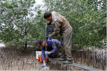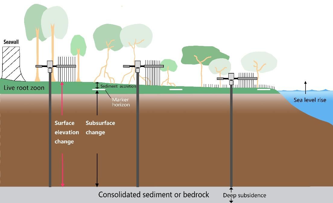 Based on M-ECORS, sediment elevation dynamic monitoring equipments have been set in both mangrove wetlands and salt marshes of Spartina alterniflora, which performs long-term dynamic monitoring on surface elevation variation, deposition rate, and shallow subsidence, etc. The collected monitoring data could be used to track the long-term evolution of surface elevation in different wetland vegetation areas accurately, providing important support for research on wetland sediment elevation variations, blue carbon dynamics as well as its response to sea level rise.