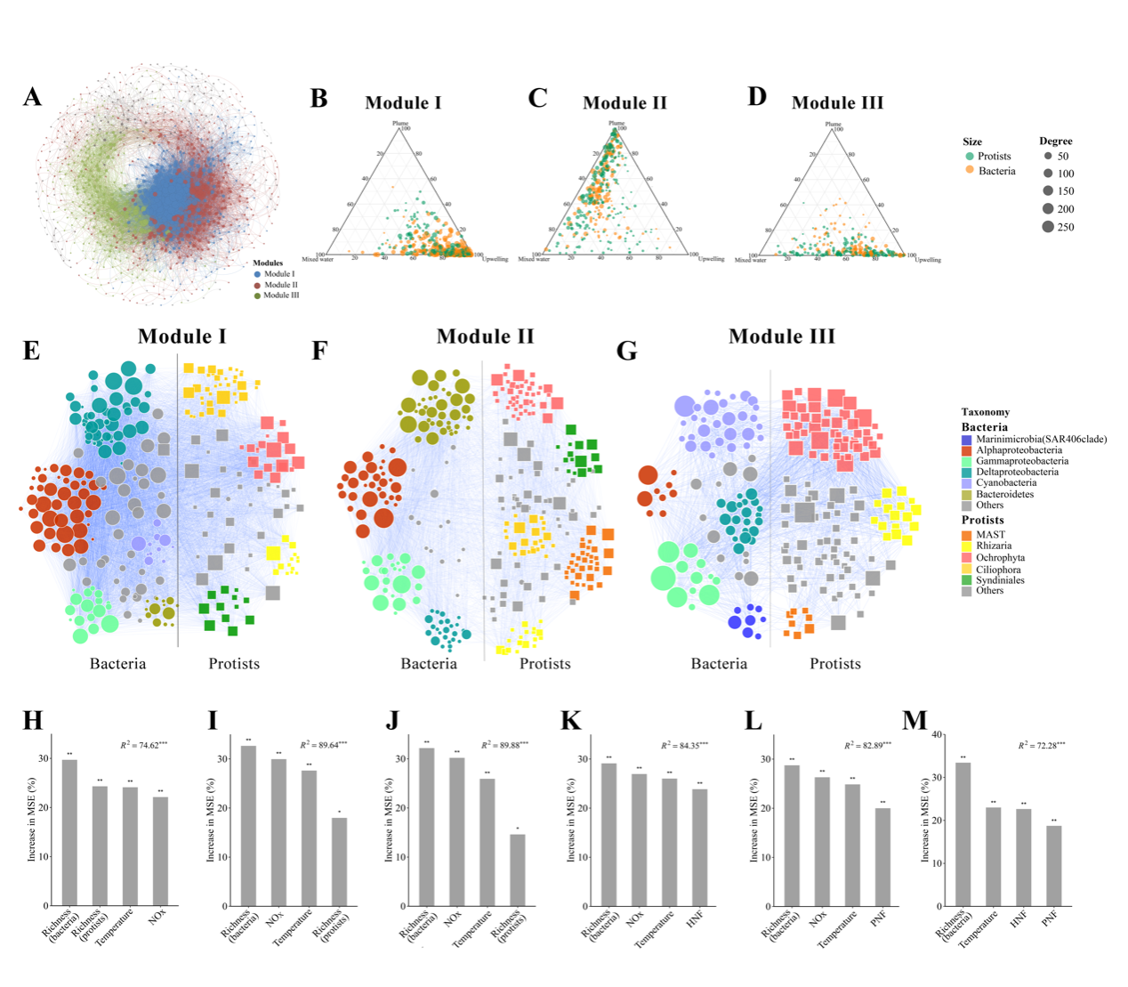 河口羽流区与近岸上升流区是海-陆界面相互作用中最重要、最典型的两个区域。河口羽流-上升流耦合系统接受大量河流径流的同时,受海水涌升等物理过程的强烈影响,系统中微生物群落与环境因素之间关系尤为复杂。以往研究多关注非生物因素对原核类群的影响,对物理过程、生物因素与非生物因素如何相互作用,驱动河口羽流-上升流耦合系统中微生物组分布模式,知之甚少。