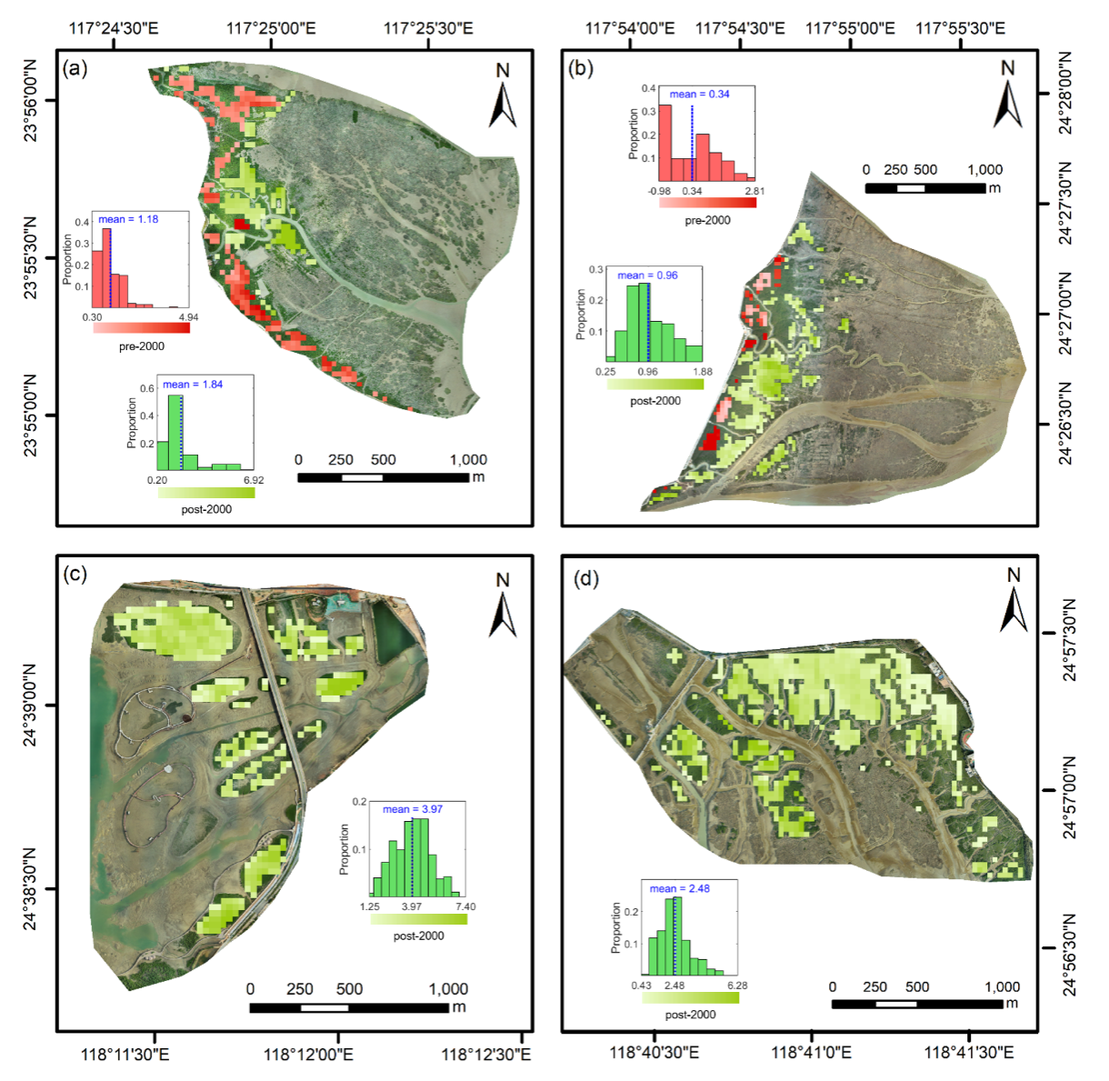 图2 红树林年轻时期(15岁以下)的AGB年累积速率(Mg DW ha-1 y-1):(a)漳江口;(b)九龙江口;(c)厦门湾;(d)泉州湾。前两者分2000年之前(红色)与2000年之后(绿色)两个湿地保护阶段来计算红树林AGB年累积速率。