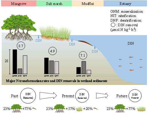 近日,厦门大学福建台湾海峡海洋生态系统国家野外科学观测研究站、环境与生态学院陈能汪教授所领衔的“环境过程与系统模型”研究团队,在滨海湿地氮循环及其调控机制方面取得新进展,相关成果以“Salt marsh expansion into estuarine mangrove mudflats reduces nitrogen removal capacity”为题发表于国际期刊Catena.