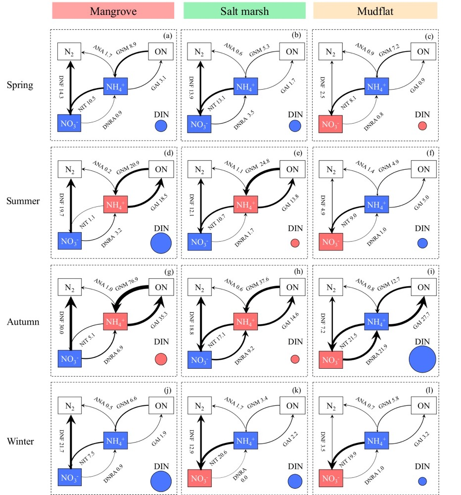 图2. 2020年5月(春季)、7月(夏季)、11月(秋季)和2021年1月(冬季)红树林、盐沼和滩涂沉积物中NH4-N、NO3-N和DIN的净累积(红色)和净去除(蓝色)。黑色箭头的粗细及数字的大小代表矿化(GNM)、同化(GAI)、硝化(NIT)、反硝化(DNF)、厌氧氨氧化(ANA)和异化还原(DNRA)速率的相对大小