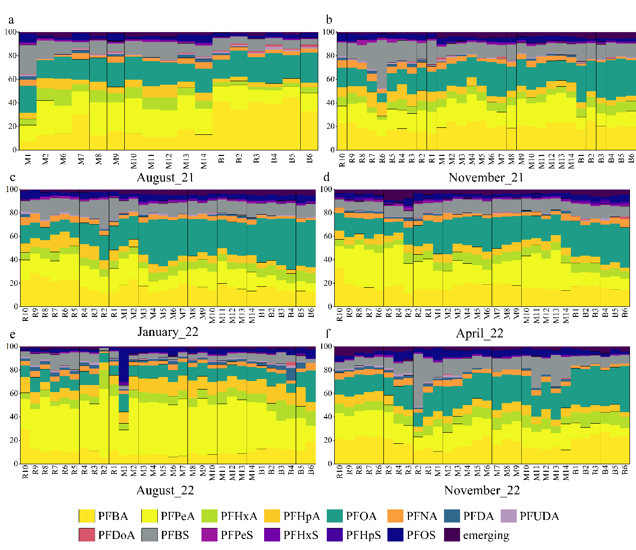 依托福建台湾海峡海洋生态系统国家野外科学观测研究站(简称“台海站”),研究团队进一步以一个典型的亚热带河流-红树林河口-海湾连续系统(漳江-漳江口-东山湾)作为研究区域,通过6次季节性采样获取水样并进行25种PFAS化合物的检测分析,通过对河流-红树林河口-海湾系统PFAS空间分布、季节变化分析以及利用正定矩阵因子模型确定该研究区域PFAS的主要污染来源,发现了浙闽沿岸流对漳江口和东山湾PFAS分布的季节性影响,为红树林河口污染物的研究及保护奠定了一定的理论基础。