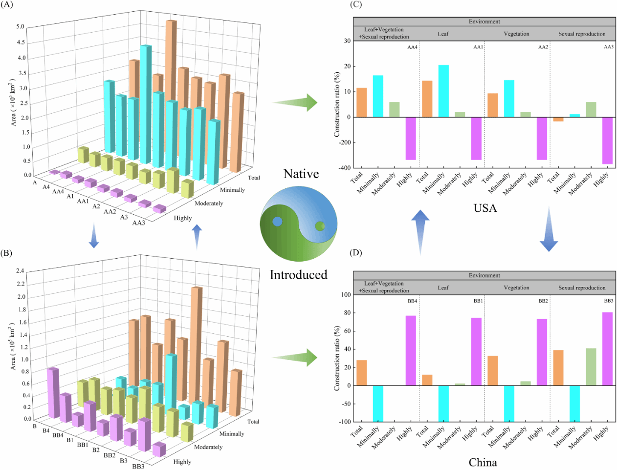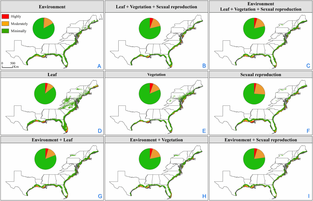 生态位模型整合植物功能性状参数可显著影响互花米草的生态位空间格局。原产地因互花米草生态位保守性较强,功能性状对适生区的影响较弱(图2);而入侵地互花米草的生态适应过程与原产地不同,导致功能性状贡献度提升2-3倍,尤其在31°N以北和24°N以南形成显著纬度梯度响应格局(图3)。此外,不同功能性状效应分析表明,繁殖性状对分布格局的影响显著高于营养生长性状和叶片性状。通过模型对比证实,功能性状的纳入使原产地与入侵地适生区面积分别缩减-2%–10%和10%–40%,其空间收缩强度与功能性状相关(图4)。