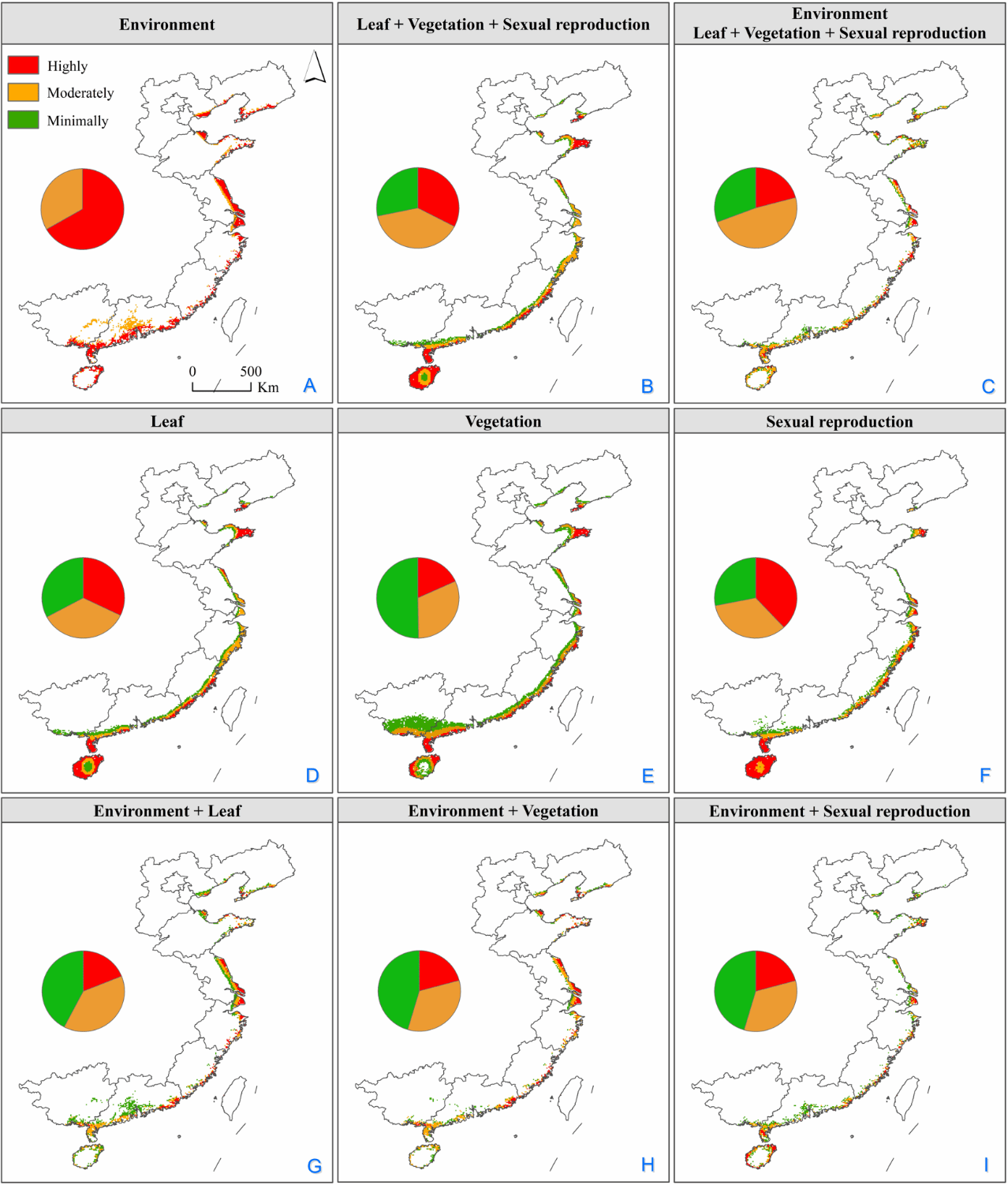 图3 互花米草在入侵地中国沿海的潜在分布区,A–I为不同的生态位建模