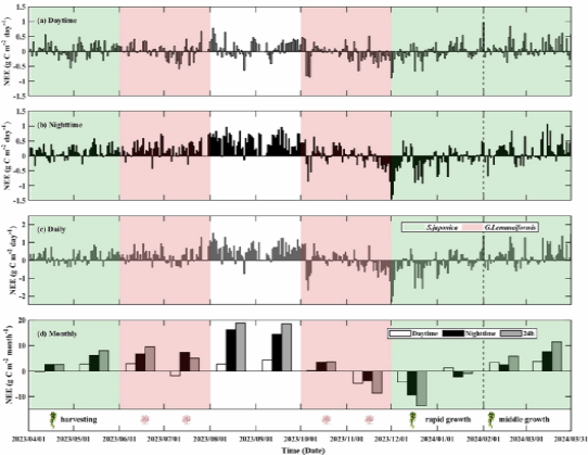 研究利用涡度相关法在中国东南亚热带半封闭海湾(福建三沙湾)的大型海藻养殖区(海带和龙须菜轮养)开展了为期一年(2023年4月~2024年3月)的生态系统NEE高频连续观测,获得以下科学认识:(a)生态系统在大多数月份表现为大气CO2的源,其中最强的源和汇分别发生在初秋(无养殖期)和初冬(海带快速生长期);(b)生态系统全年向大气排放58.9 g C m-2,其中夜间(无光合作用)贡献了全年排放的84.7%(c)大型海藻养殖有助于减少水体的CO2排放,但其减缓程度因养殖类型(海带养殖期最明显)和生长阶段(海带快速生长期最明显)而异;(d)NEE时间变化与大气温度的相关性最强,张落潮时段更快的潮汐流也会促进水体的CO2排放。该研究表明了涡度相关通量观测在解析大型海藻养殖区NEE多尺度时间变化规律及其环境调控中的重要作用,证实了大型海藻养殖有助于减弱亚热带海湾水体的碳排放。