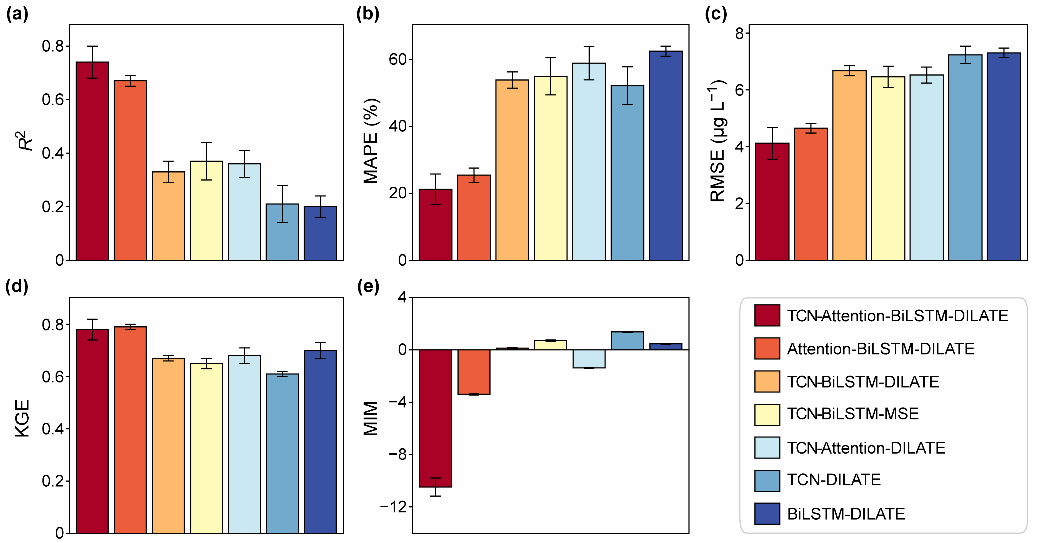 模型消融实验结果表明,TCN与BiLSTM的结合相较于单独使用TCN或BiLSTM,使R⟡分别提高了0.12和0.13,而进一步融合注意力机制后,TAB模型(TCN-Attention-BiLSTM)将R⟡提升至0.74。同时,MIM值由正变负,表明该机制在抑制数据复制方面发挥了关键作用。此外,采用DILATE损失函数相较于传统MSE损失,能显著降低低浓度区间的预测误差,提升幅度达10.57%。以上结果验证了TAB模型在藻华短期预测中的有效性,并表明DILATE损失函数与注意力机制对提高模型鲁棒性的重要作用。