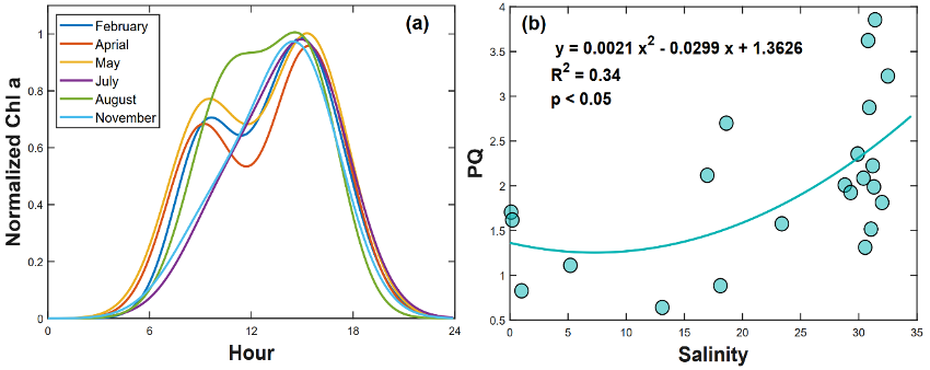 图1.(a)不同月份叶绿素周日变化;(b)光合熵(PQ)与盐度的关系