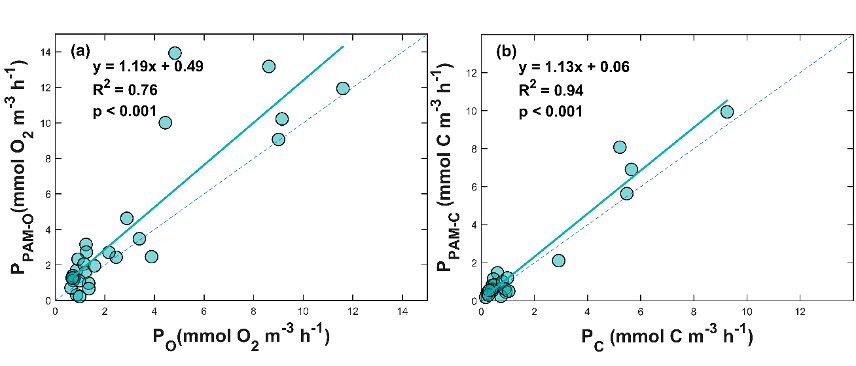 图2. 基于PAM估算的初级生产力与黑白瓶氧释放速率(a)和固碳速率(b)的关系