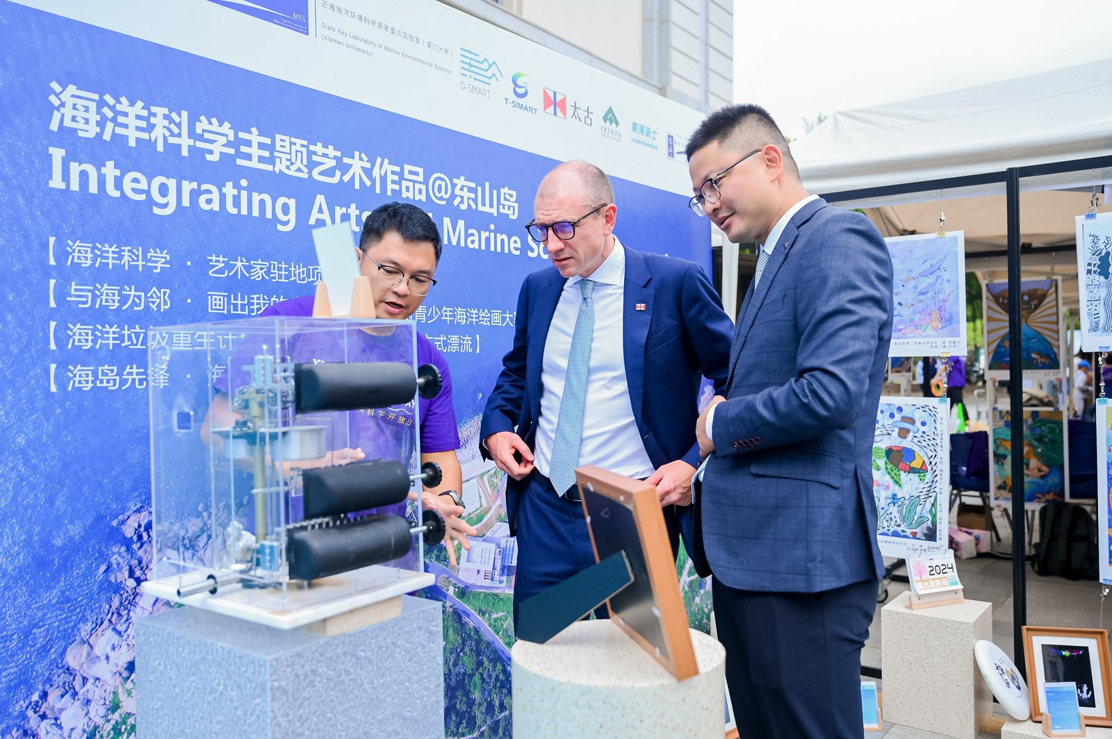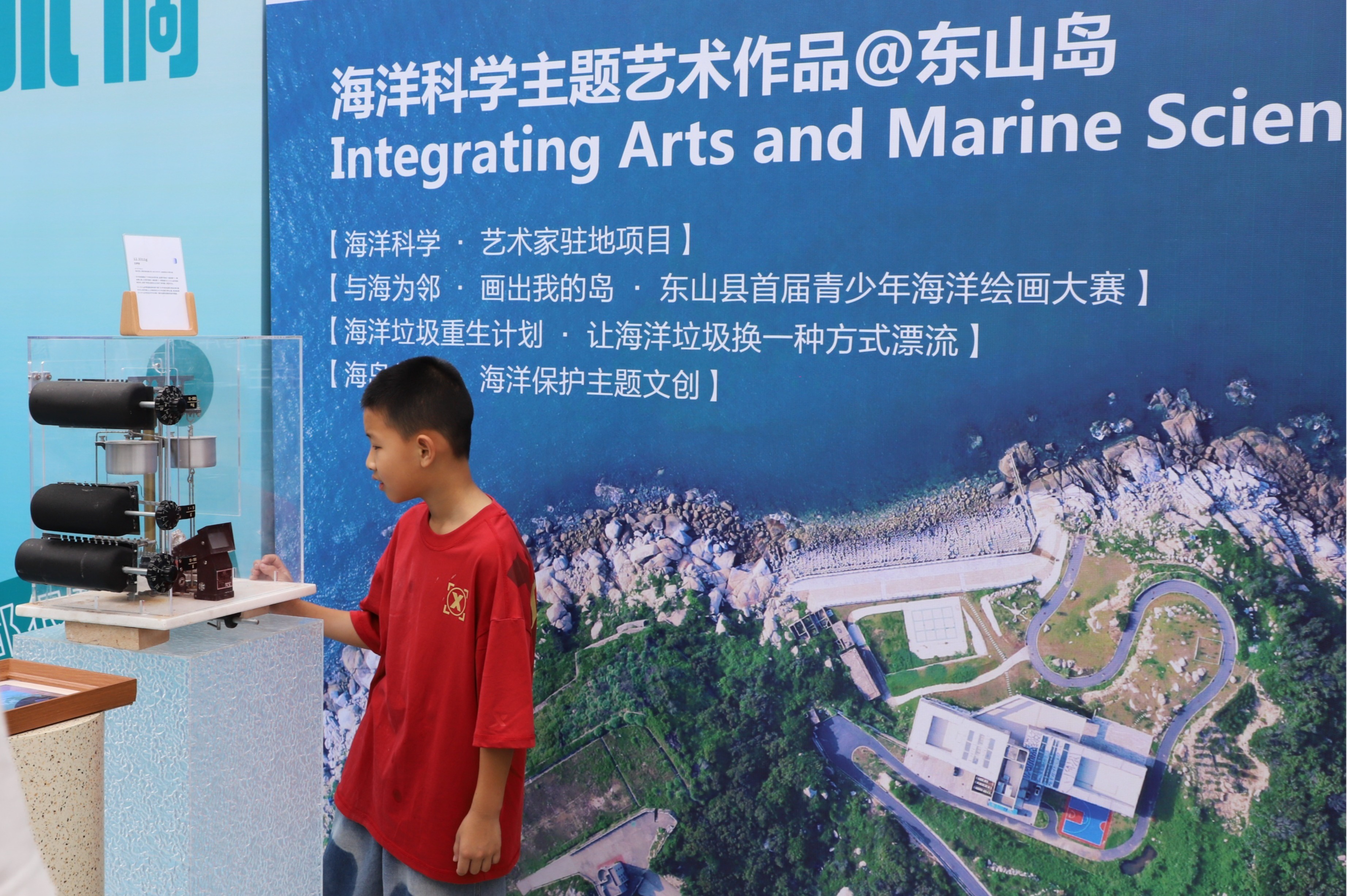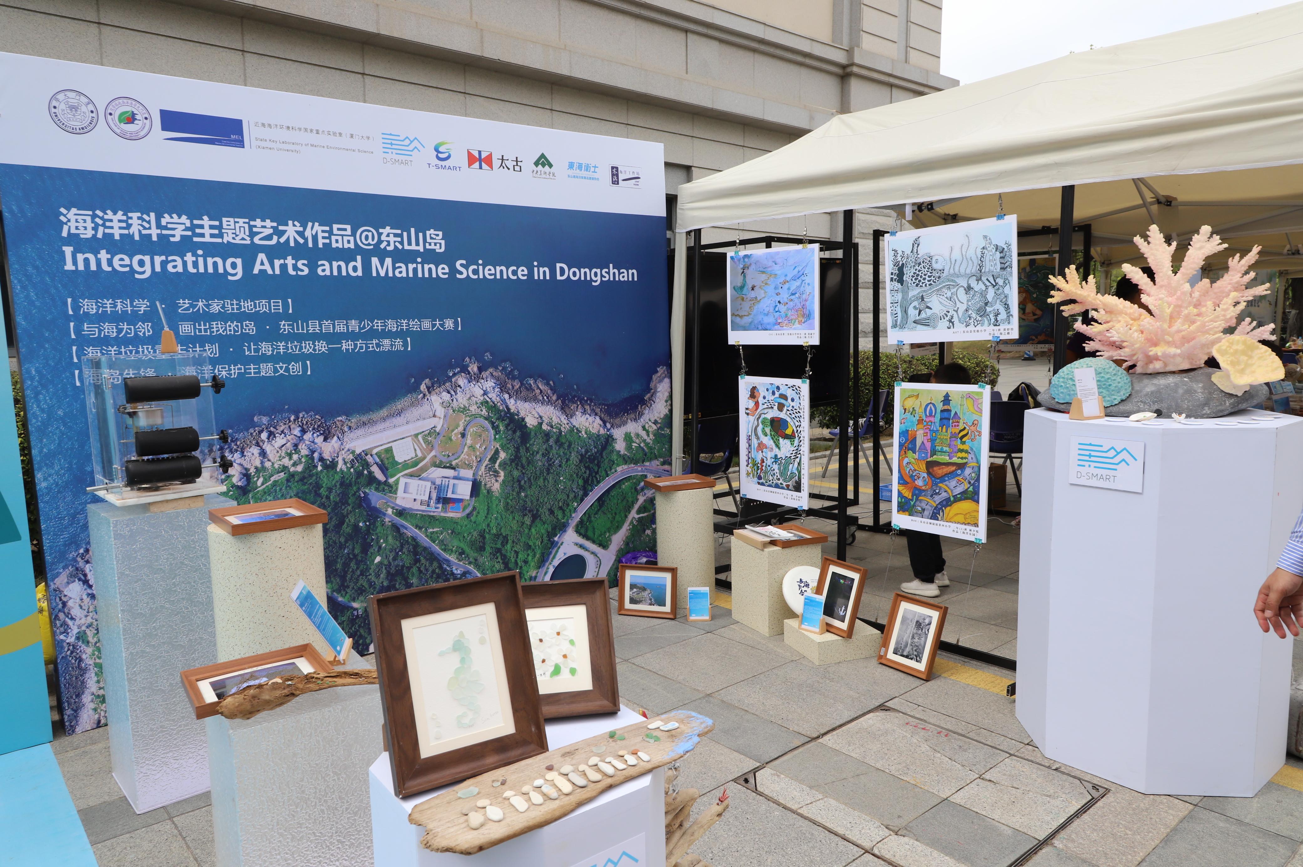 展区四周陈列着东山县首届青少年海洋绘画大赛获奖作品,以及东山当地海岛青年利用海漂垃圾结合海岛文化、海洋保护理念创作的文创周边,向公众传达敬畏自然、保护海洋的理念。