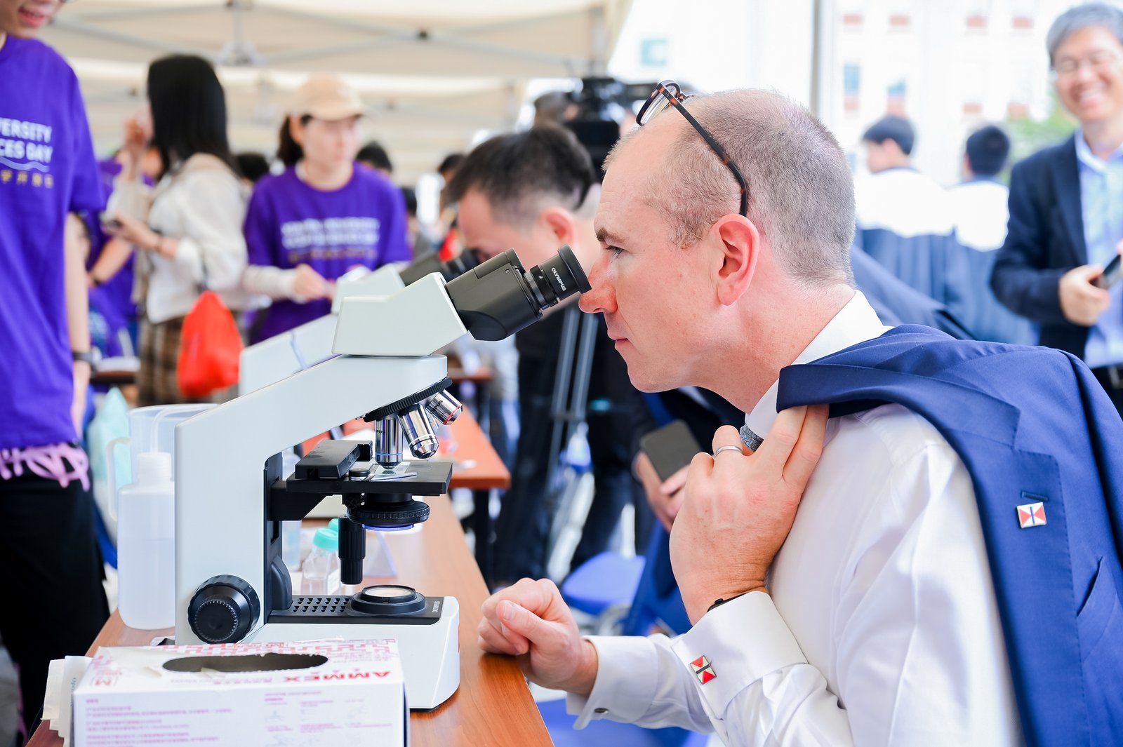 香港飞机工程有限公司行政总裁、太古集团慈善理事会主席邵瑞德 (Richard Sell)用显微镜观察浮游植物