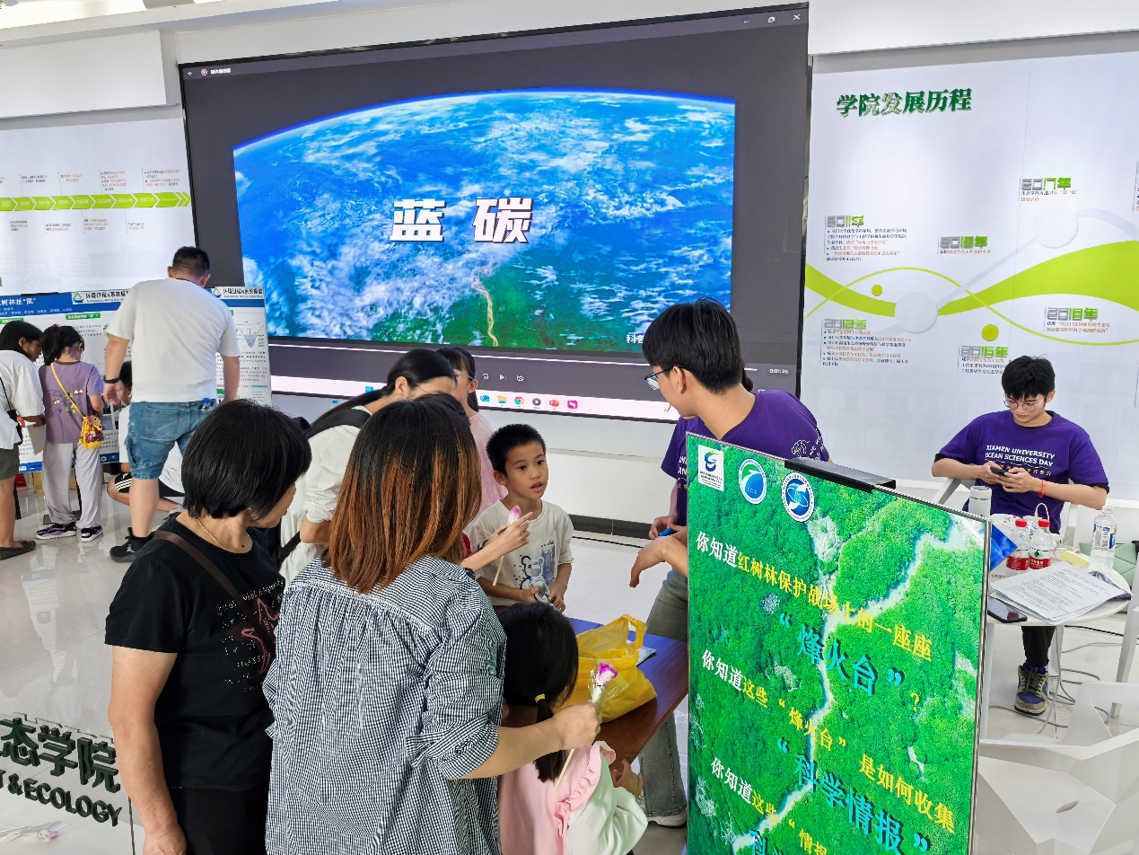 在台海站与滨海湿地碳循环研究组共同设置的“数字赋能、‘碳’索湿地”展区,志愿者们以漳江口滨海湿地为例,利用可视化的数字模型,全方位展现滨海湿地蓝碳监测、评估与保护,增进公众对红树林、盐沼等滨海湿地蓝碳的认识,提升蓝碳保护意识。