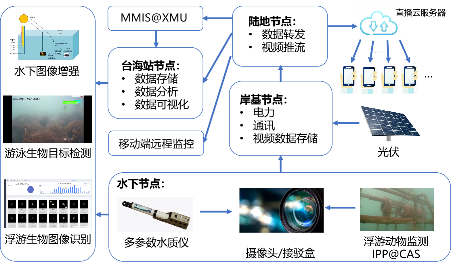 3. 高带宽稳定数据连接。系统结合海底电缆传输、无线桥接、有线宽带等传输方式,实现水下视频数据和水环境参数数据的实时远距离传输和远程控制管理,满足多点部署形成观测网络的需求。