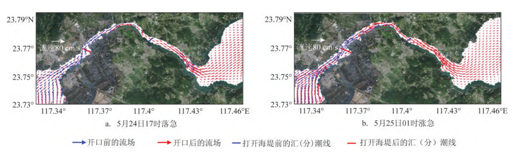 图3 数值模拟八尺门水道涨落急垂向平均流态(万艳:《东山八尺门海堤开口水动力及冲淤影响数值研究》,载于《海洋预报》2022年第6期,第20页。)