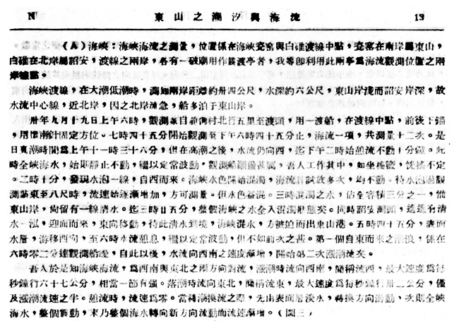 图2 唐世凤发表1941年东山海峡物理海洋学观测成果的论文截图(《东山之潮汐与海流》,载于《海洋集刊》1943年第2期,第13页。)