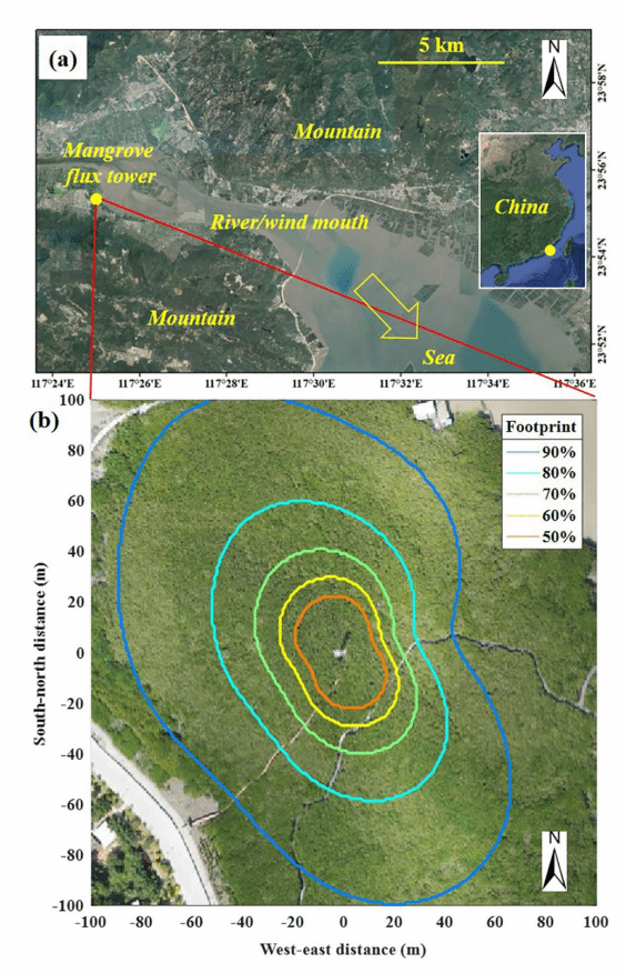 图4 漳江口红树林湿地长期定位研究站通量塔位置及足迹(载于:Zhu, X., Qin, Z., & Song, L. (2021). How land-sea interaction of tidal and sea breeze activity affect mangrove net ecosystem exchange? Journal of Geophysical Research: Atmospheres, 126: e2020JD034047.)
