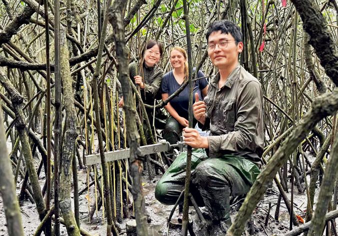 图5 2024年,陈鹭真(左)和同行们在海南样地开展蓝碳监测工作(载自:http://www.chinatoday.com.cn/zw2018/bktg/202407/t20240716_800371950.html)