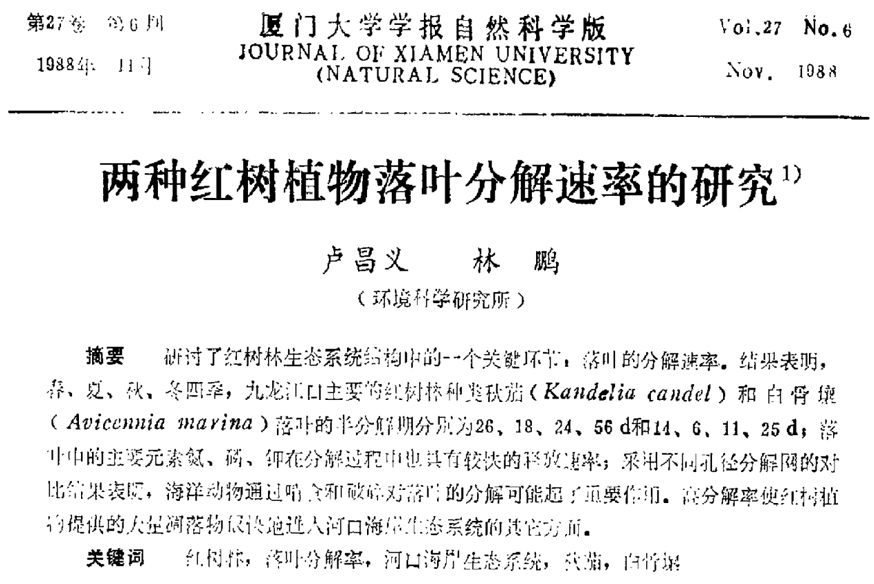 卢昌义、林鹏:《两种红树植物落叶分解速率的研究》,载于:《厦门大学学报自然科学版》1988年第27卷第6期,第679-683页。