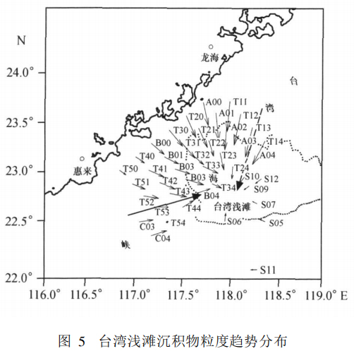 老海:20世纪中期开始,沉积学家尝试用分析方法简单易行的沉积物粒度组成来识别沉积环境类型。1978年,英国海洋沉积学家McCave最早将粒度参数的平面差异定义为“粒度趋势”,并认为它是沉积物输运、堆积的结果。运用“沉积物在输运方向上分选变好”的经验判据,加拿大 McLaren于1985年提出了一维粒径趋势分析方法。1992年,海洋二所选派到英国攻读博士学位的高抒与其导师Collins教授, 提出了二维粒径趋势矢量图像的沉积输运信息提取办法,并在网站上共享了被称为“Gao-Collins方法”的计算程序,很快得到同行们的广泛应用。回顾30年来东海陆架和南海北部陆架获得的Gao-Collins方法分析成果,陆架砂的Gao-Collins粒径趋势矢量汇聚中心,多与厚层陆架潮流沉积砂体对应,比如黄海南部的苏北浅滩、台湾海峡南部的台湾浅滩(图1)、琼州海峡东西两口的潮流三角洲、海南岛西侧浅滩,等等。陆架向岸一侧,粒径趋势多指向河口拦门沙,并明显存在沿岸运动趋势。陆架向海盆一侧,粒径趋势则指向陆坡,也具沿陆架坡折运动趋势。