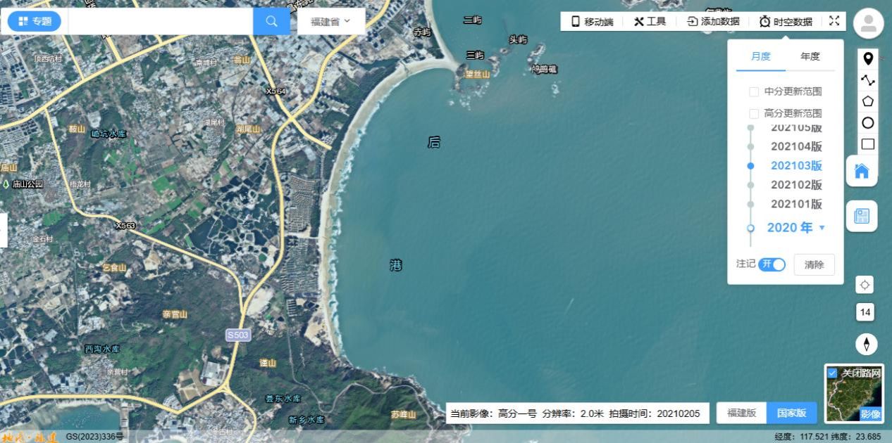 图4 2021年2月5日的东山岛金銮湾海滩真彩色遥感图件截图。位于樟塘溪口(东尺港)沙源近端的海滩北段耗散型海滩发育。位于沙源远端的南段已渐变为韵律沙坝型海滩。【下载自:https://fujian.tianditu.gov.cn/map/】