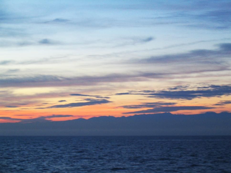 老海:记得是第二航段的一个清晨,“延平2号”船正沿着台中至新竹外侧的海峡航道移向下一个站位,东方既白,朝霞漫天,忽然间映出宝岛中央山脉的山脊线,有了静海云天的衬托,显得格外恬静秀美(图5)。这也是紧张工作日程中难逢的诗境吧!