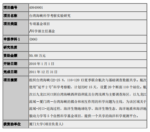 图1 国家自然科学基金委员会关于2009年科学部主任基金《台湾海峡科学考察实验研究》(专项基金项目编号:40949901)通知的截图