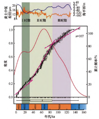 图2 许岱玉等《福建晋江颜厝老红砂的光释光测年及其环境指示意义》论文截图(《中国沙漠》2024年第44卷第2期,第11-24页):全球海平面变化标准曲线与华南沿海老红砂光释光年代频率累计曲线