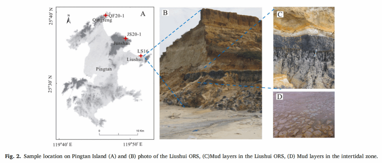 图5 徐勇航等《Late Pleistocene sea level change and tectonism control on the formation of the Old Red Sand along the southeastern coast of China》论文截图(Palaeogeography, Palaeoclimatology, Palaeoecology, 2024, 637:112018):平潭岛流水老红砂剖面位置与现场照片